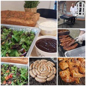 Maten kommer da klar til å legges på grillen. Salater og tilbehør kommer i skåler som kan settes rett på bordet.