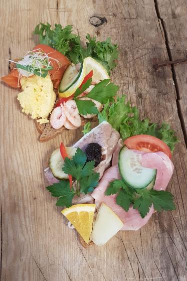 KjøpFire stykk snitter; en med røkt ørret og eggerøre, en med reker og majones, en med sylte og rødbetsalat og en med juleskinke med waldorfsalat.