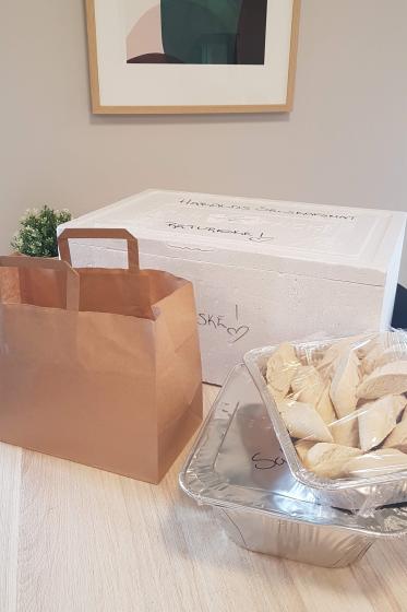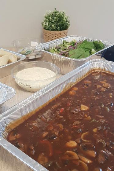 Biff stroganoff, ris, frisk salat, dressing, fine baguetter og smør.