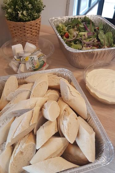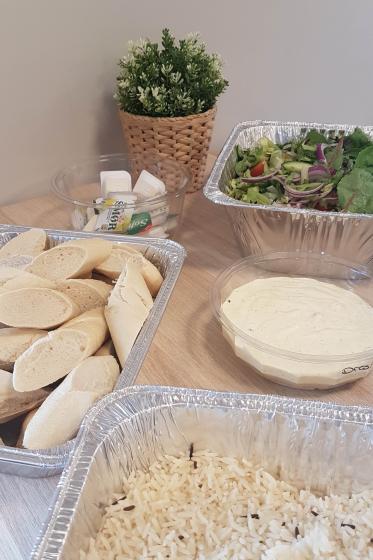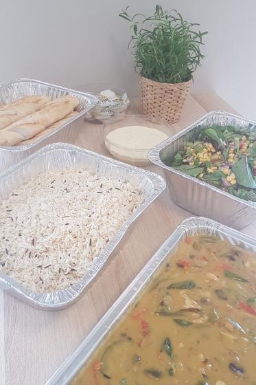 Kyllinggryte med karri og kokosmelk, ris, frisk salat, dressing, fine baguetter og smør.